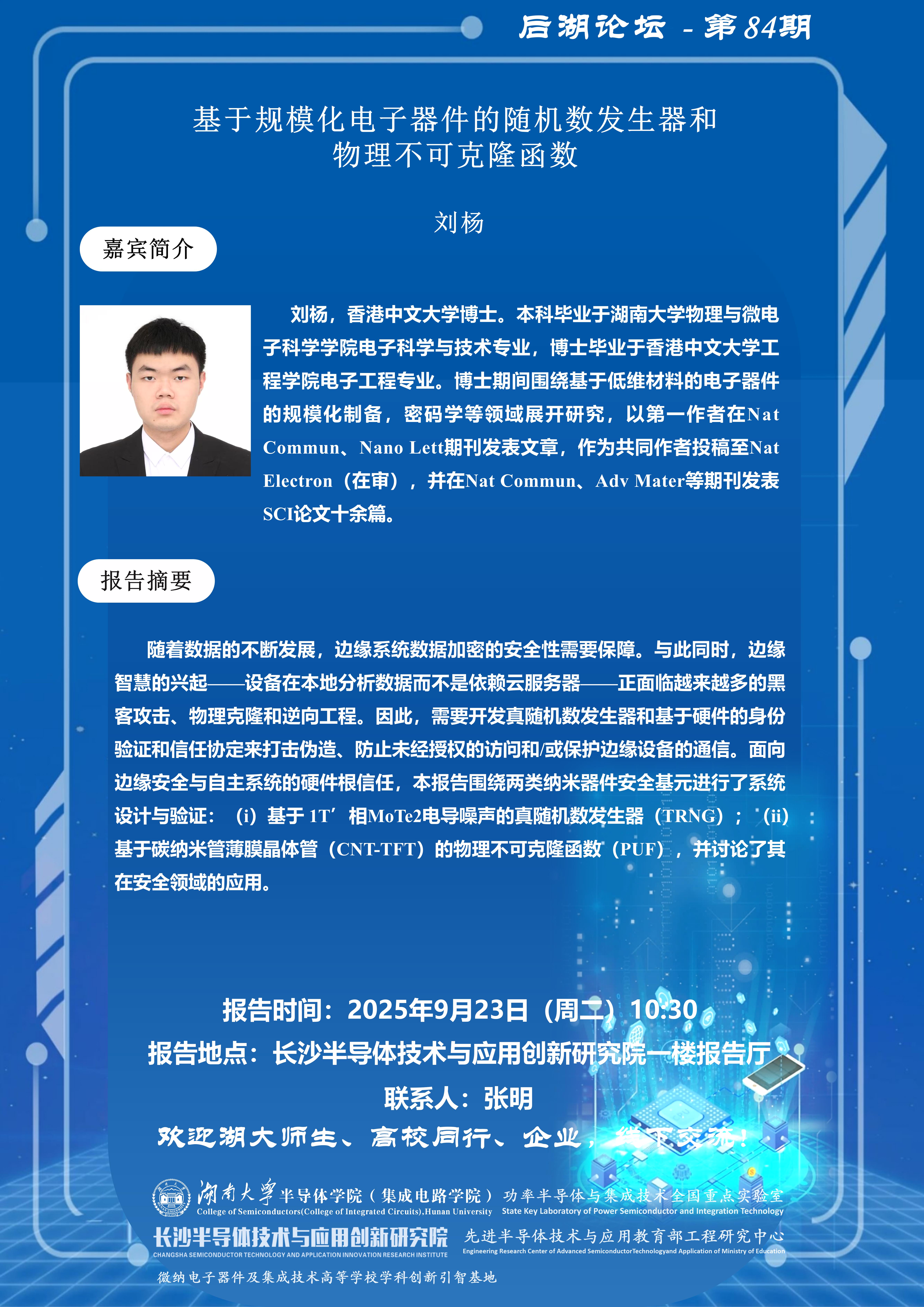 后湖论坛第84期:基于规模化电子器件的随机数发生器和物理不可克隆函数